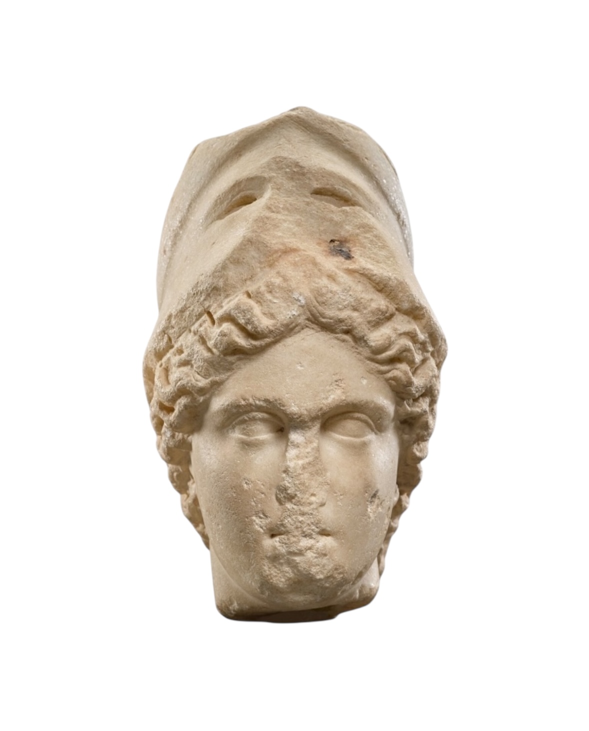 This marble head of the goddess Athena, close to the Vescovali type, is a Roman copy of a Greek 4th century BC prototype. Cf. LIMC, Athena, no. 253: Cyrene Museum 14033. The head would have come from a full-length statue of the goddess, draped and wearing her aegis. The statue is conventionally attributed to a range of masters associated with the late 4th century BC, one of which is Praxiteles.